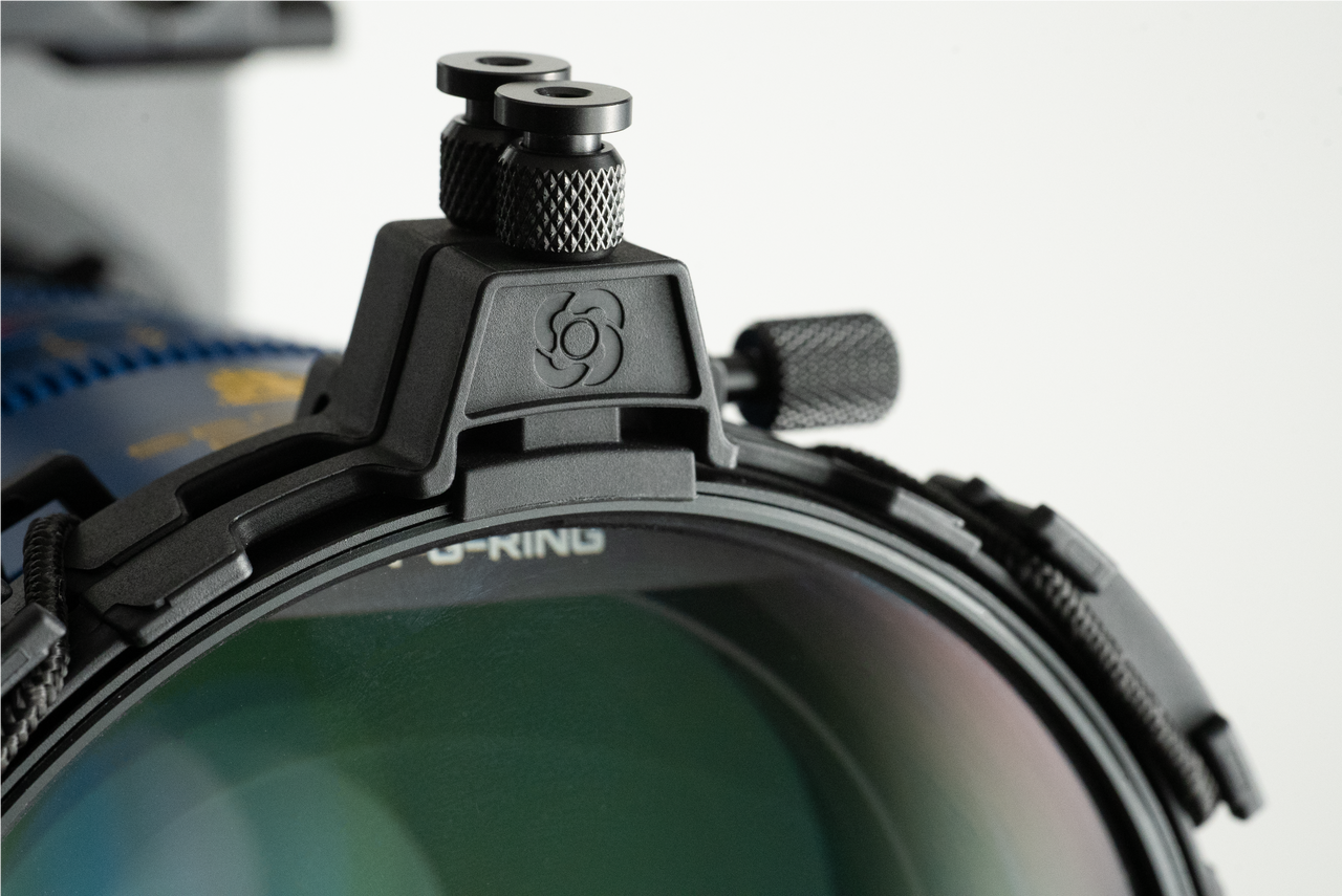Working with diopters, polas and other round optical elements often involves slow or impractical mounting methods. The Circular Glass Adapter (CGA-138) solves this by mounting 138 mm circular glass directly to the Bun-G-Ring via the bungee cords, keeping the setup as minimal as possible.